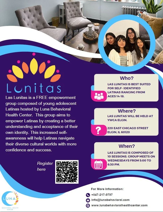 YWCA Elgin is proud to support and host Las Lunitas, a free empowerment program for young Latinas. This program is offered by Luna Behavioral Health Center and is designed to help participants strengthen their self-awareness, build confidence, and embrace their identity.